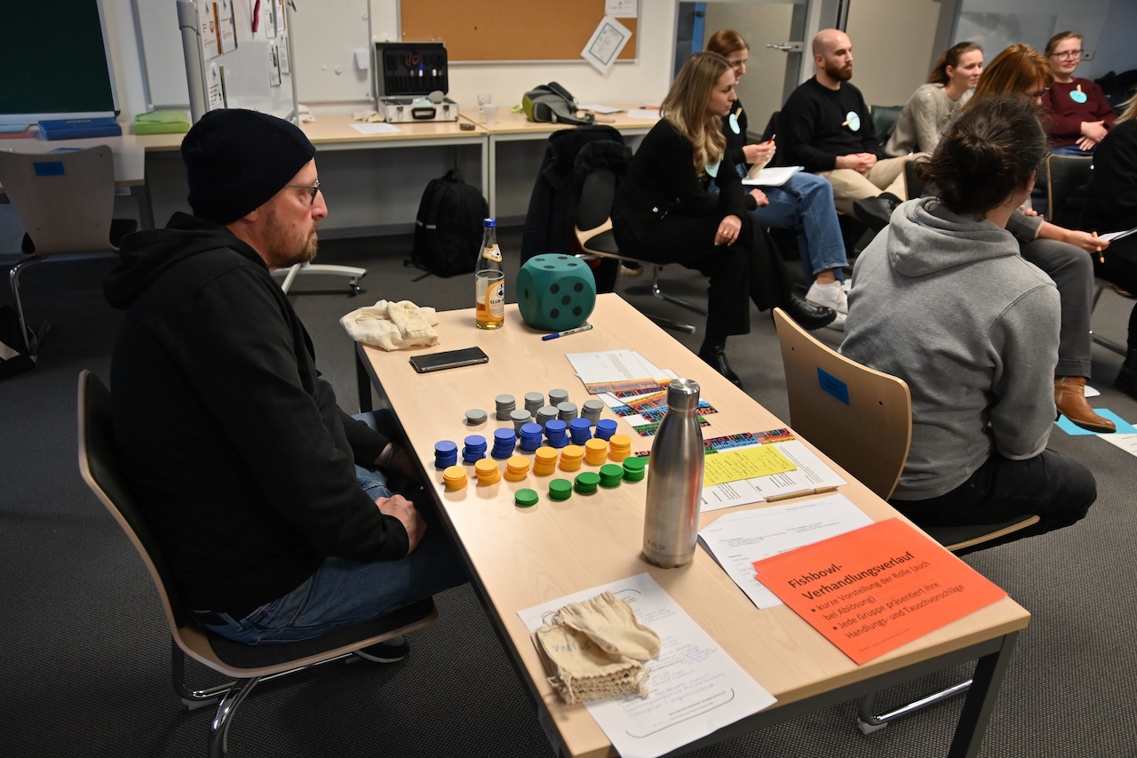Nach einer aktivierenden Einführung übernahmen die Teilnehmenden unterschiedliche Akteursrollen und verhandelten mit klar zugewiesenen Ressourcen – von politischer, wirtschaftlicher und zivilgesellschaftlicher Macht bis hin zu finanziellen Mitteln. In mehreren Spielphasen entstanden dynamische Aushandlungsprozesse, Koalitionen, Konflikte und überraschende Wendungen. Ob Verhandlung oder Konfrontation, Eskalation oder Deeskalation – jede Entscheidung hatte spürbare Folgen.